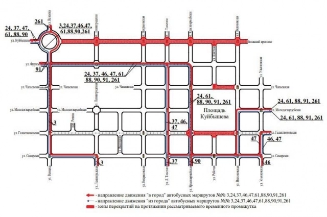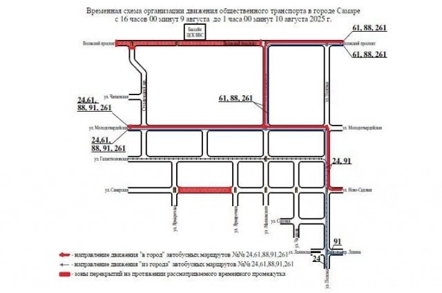 С 16:00 9 августа до 01:00 10 августа автобусы №№ 3, 24, 37, 46, 47, 61, 88, 90, 91, 226 и 261, а также троллейбусы № 6, будут ходить в объезд перекрытых участков, сообщили в администрации Самары.