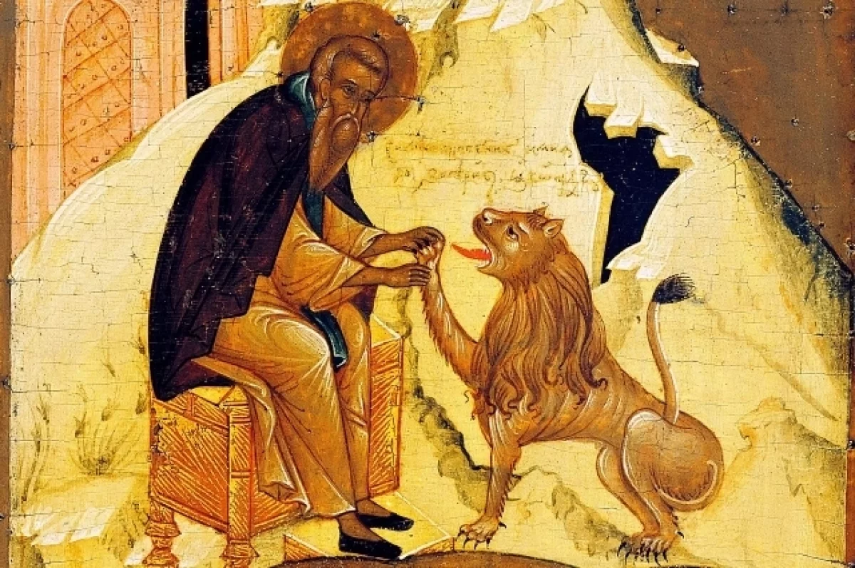 Герасим Иорданский жил в V веке. Став монахом, он в 450 году поселился на берегу реки Иордан в Палестине, в тогдашней Византийской империи, где основал монастырь и стал его настоятелем. Изо всех его деяний самым известным стала история о приручении дикого льва, которого монах вылечил от ран, и зверь в качестве благодарности жил в монастыре, часто приходил к старцу и брал у него из рук пищу, а когда Герасим умер — лёг на могилу и скончался, потому и был похоронен рядом со святым.