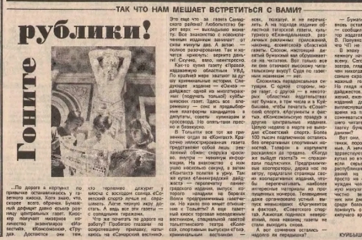 «По дороге в корпункт по привычке останавливаюсь у газетного киоска. Хотя знаю, что, скорее всего, обречён», — писал в заметке, вышедшей 8 апреля 1990 года на первой полосе «Советского спорта», куйбышевский спецкор Сергей Волков. Центральных газет, по словам журналиста, в области в те дни было не купить, «легче чёрную икру достать».